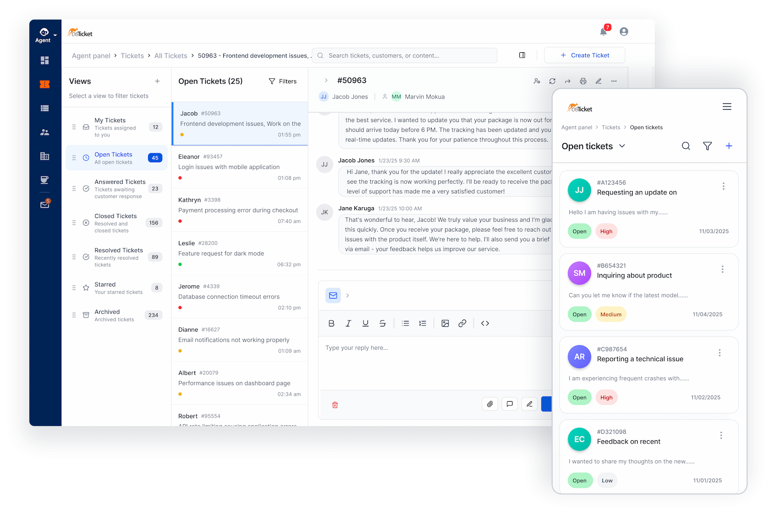 Collapsible ticket threads, improved navigation, a streamlined reply editor, and a mobile-responsive layout make it easier to scan conversations, review key details, and respond quickly without losing context.